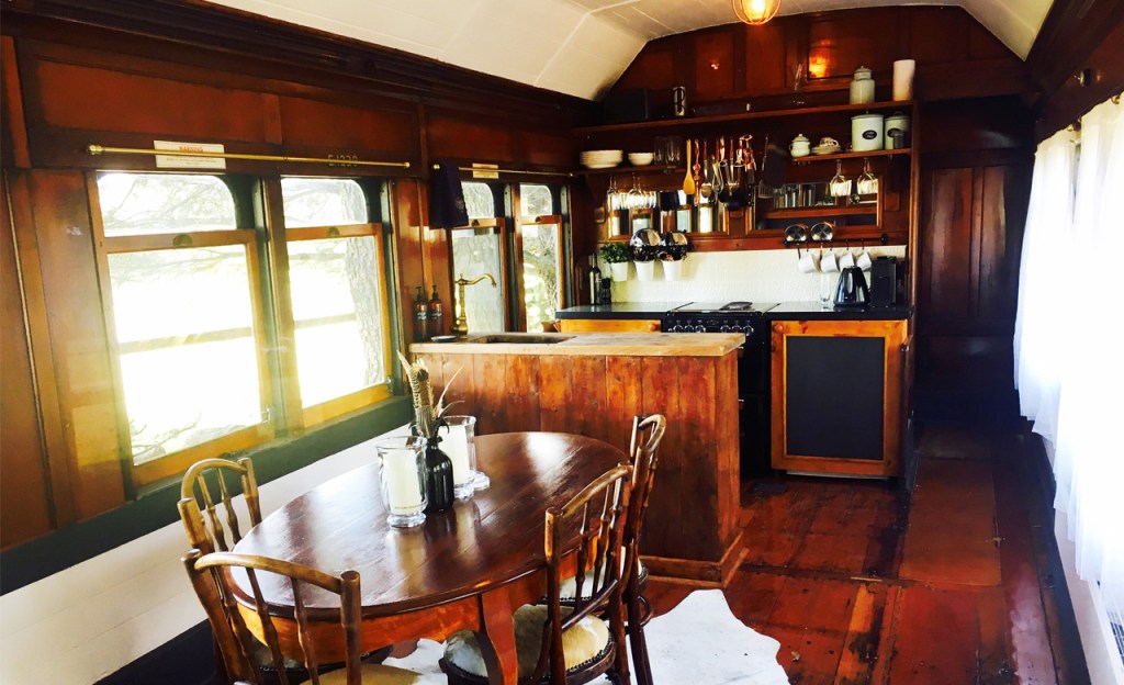 Set close to the house, and right next to chickens, doves, goats and a miniature donkey – the kids will love looking at the animals. Carriage 1238 has a king bed ‘compartment’ and 2 single bunks, and deck overlooking the paddocks with cows and sheep. Self contained and cozy – a ‘tiny house’ with a difference!