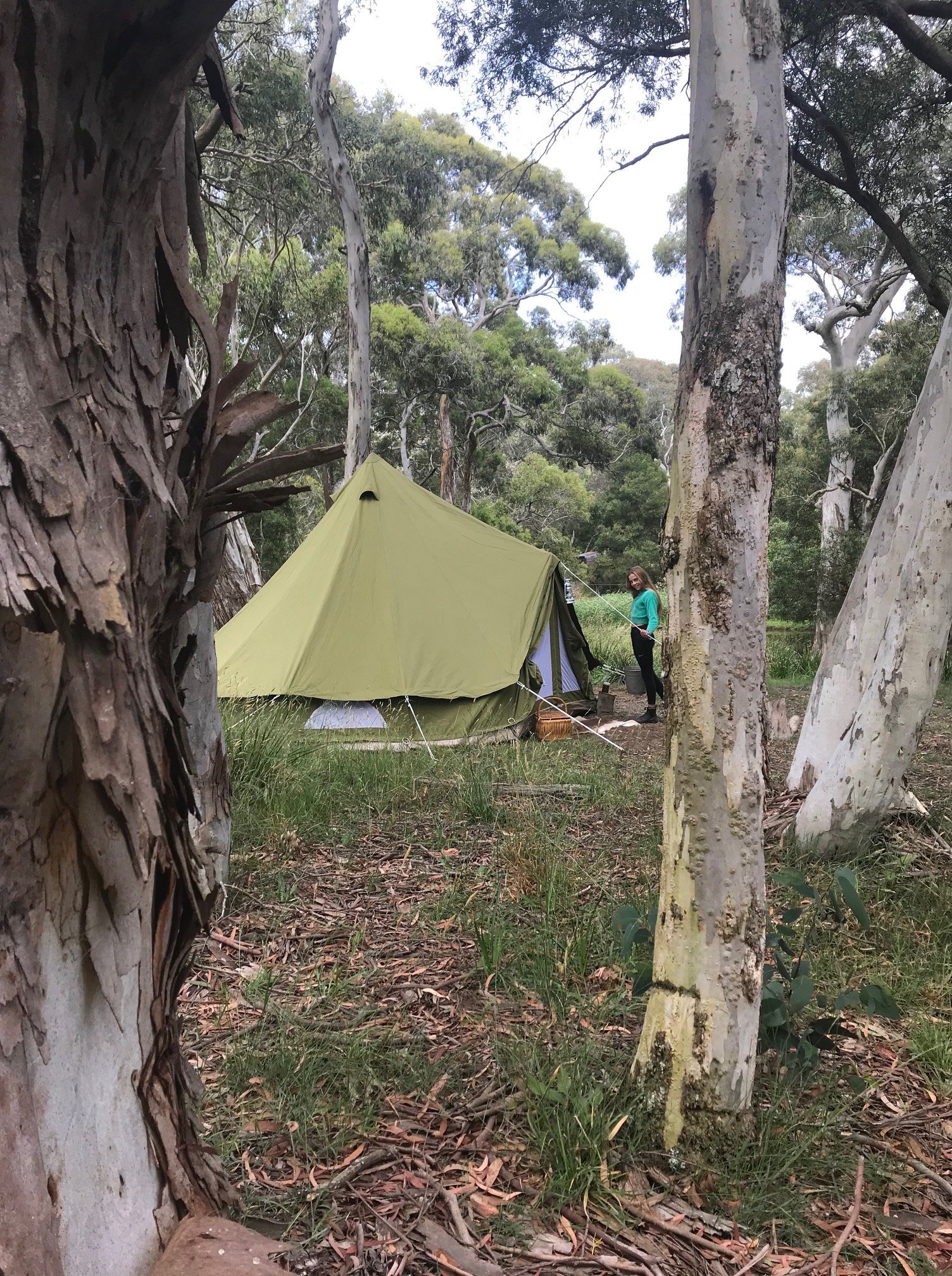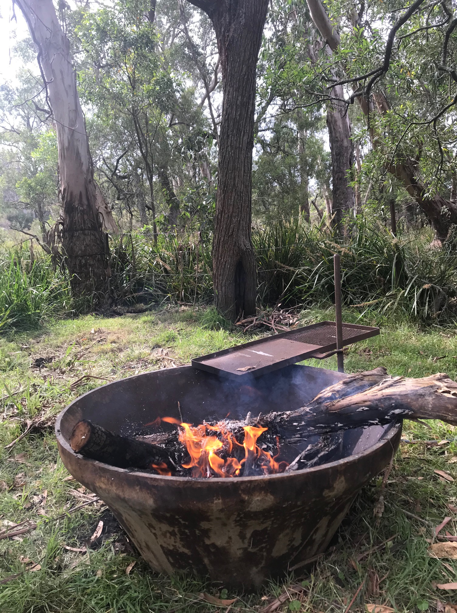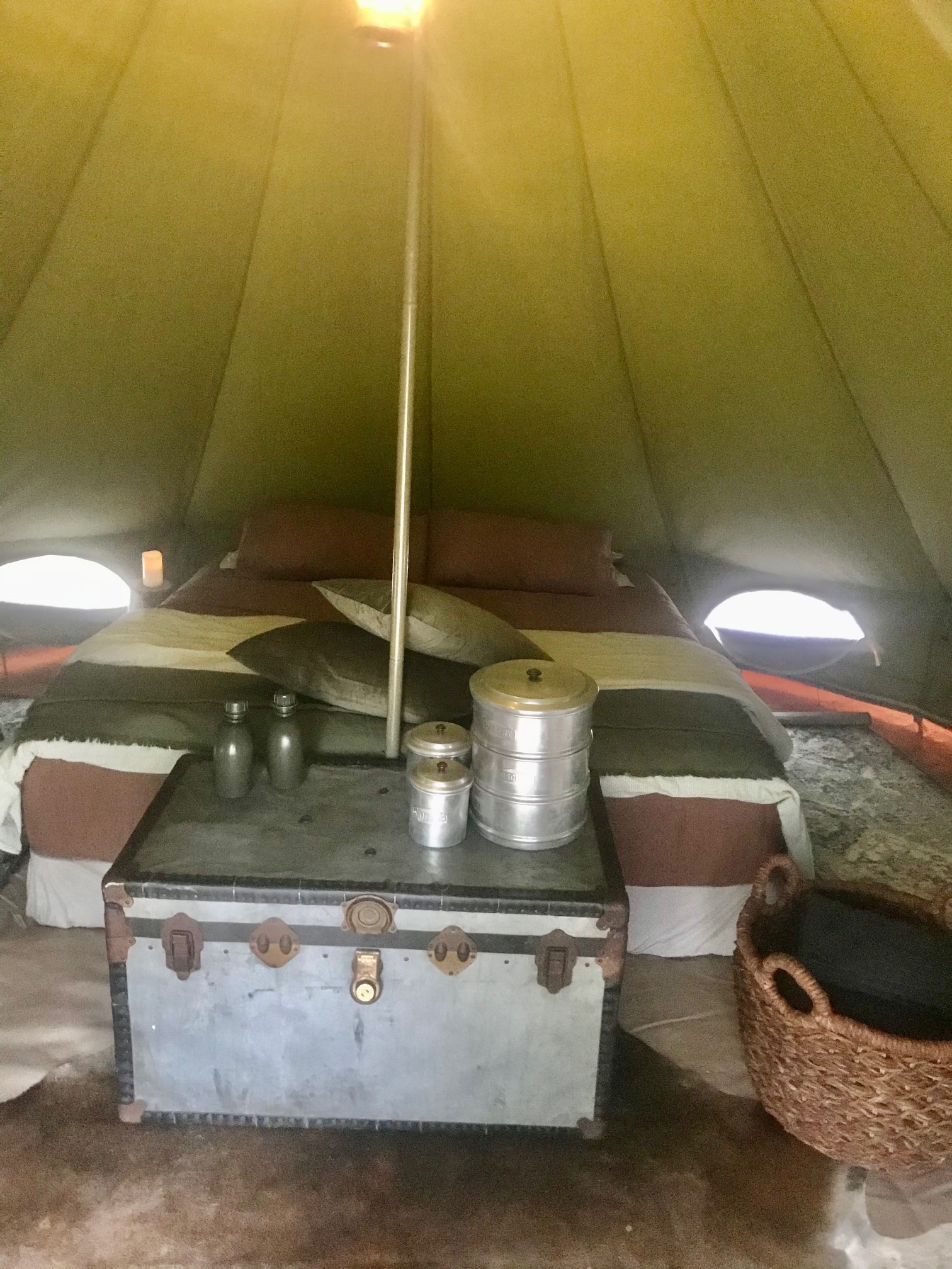 Enjoy a canvas bell tent decked out with a comfortable bed, cowhide rugs, an outdoor fire pit (conditions permitting) and the bare essentials for a relaxing, safari-style off grid adventure!