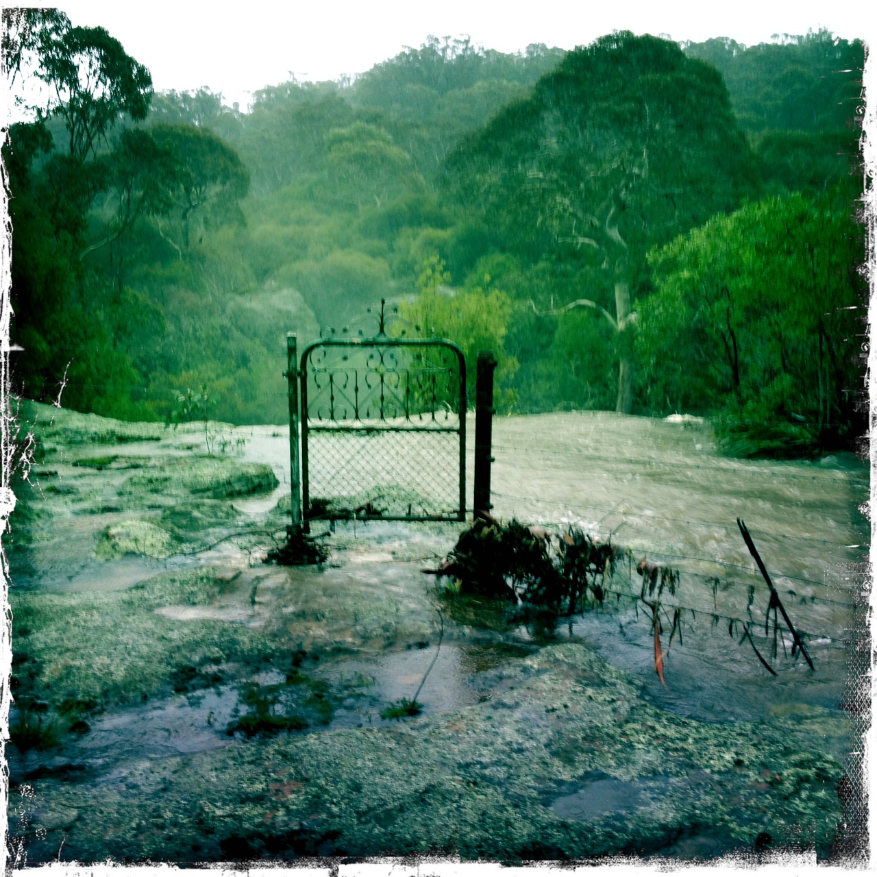 Its way to dangerous to attempt a creek crossing to go down under the Redleaf waterfall. Incredible how it can change so much in only a few days! The gate to the waterfall has obviously been underwater overnight, with debris caught in the fenceline. There is a torrent flowing over and a churning pool below that is well up the trunk of the huge gum tree – the water levels look close to the base of the rope down in fact!
